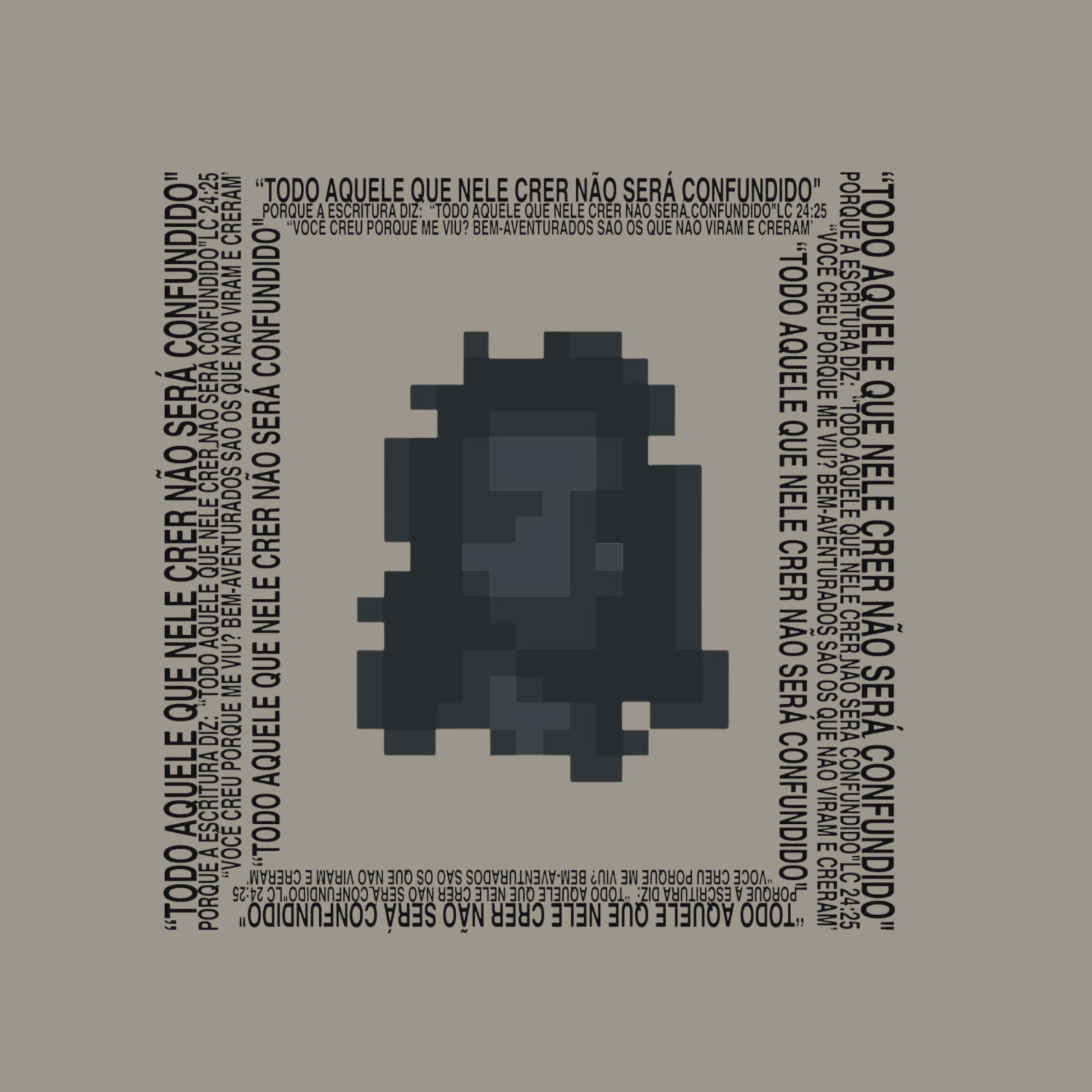 No centro da estampa, um mosaico artístico forma o rosto de Cristo, símbolo máximo de amor e redenção. Em volta, frases inspiradoras de fé e adoração compõem o design, criando uma peça que vai além da estética — é uma declaração de devoção e espiritualidade.